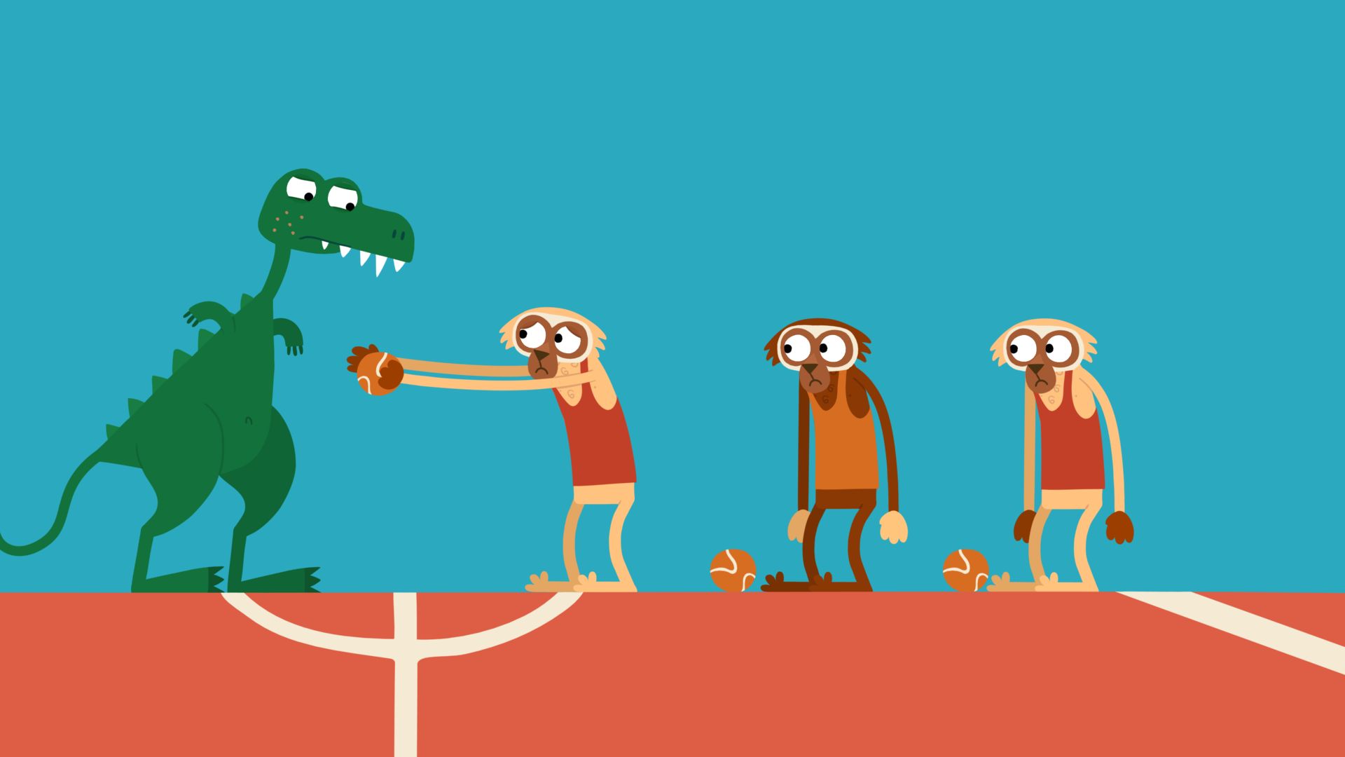 Een T-Rex die basketbalt? Het lijkt alvast geen goed idee met zulke korte armpjes. Een kleurrijke aflevering van Julia Ockers serie Animanimals.